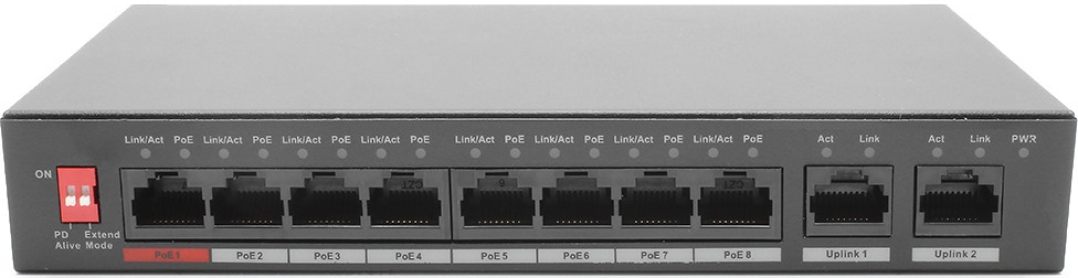 Avoiding data stream choke points between IP cameras & the NVR means smoother streaming and the capacity to dependably use greater resolution cameras with higher streaming rates. While the 8 10/100 Mbps (PoE) camera ports can assure solid camera-to-switch rates, to speed the rest of the route to the network & back to the NVR, the new PWR-POE-8-V3 has dual 10/100/1000 Mbps uplink ports to double thruput. Both ports can also be set by DIP switch to an extended mode for greater range (but at a lower speed) when needed.