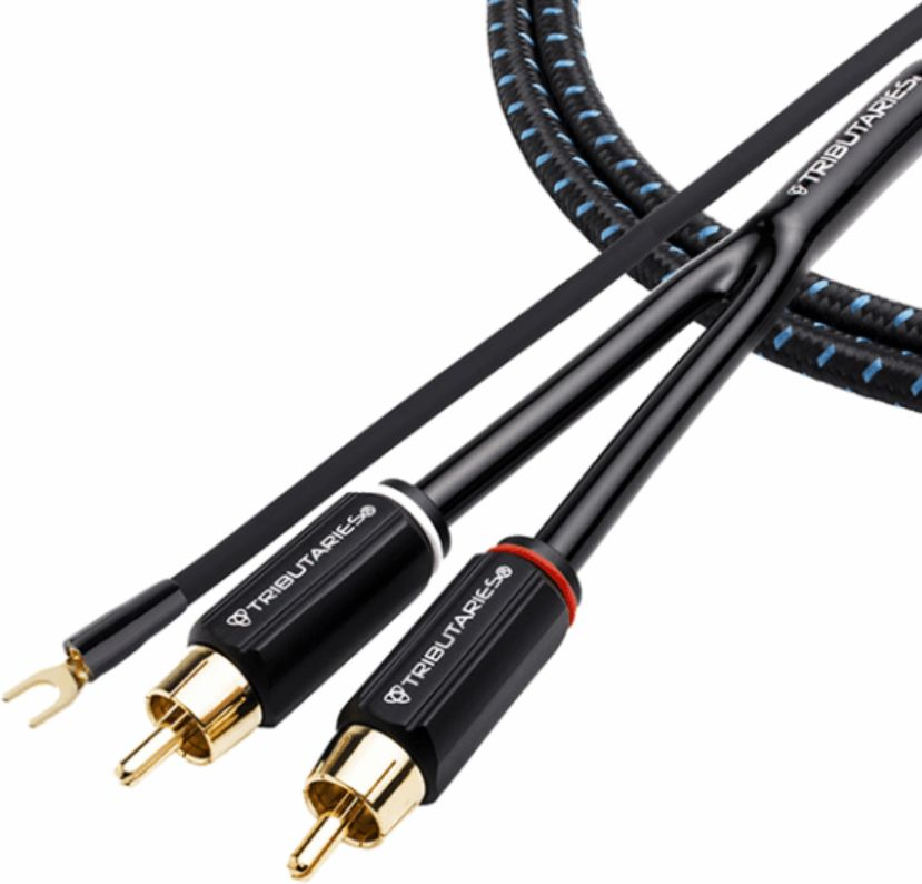All Series 4 audio cables are assembled by hand in Orlando, Florida. The Series 4 phono cable set is comprised of a S4 Single-Ended RCA audio cable and ground wire. Series 4 Single-Ended RCA cables begin with ultra-pure highly conductive oxygen free copper (HC-OFC) developed specifically for audio applications. Each conductor is a solid single gauge wire chosen to support multiple frequencies and to prevent grainy distortion caused by stranded wire. Tributaries Twin-Axial cable design is perfect for unbalanced analog audio systems. In the Twin-Axial design there are dedicated conductors with equal impedance for positive and negative signals. The signal conductors are wrapped with dual shielding to keep noise from reaching the single path. The ground wire is a flexible 20AWG stranded wire terminated with a gold plated spade lug that will fit ground posts that are 4mm and smaller. The Series 4 Single-Ended RCA cable is a high performance cable that looks as good as it soundsRead More